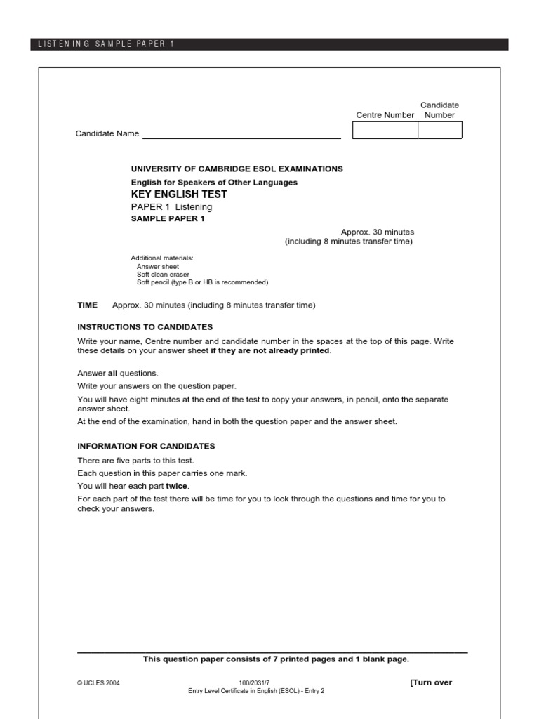 A1 English Test Sample Papers Pdf